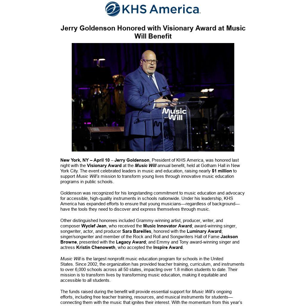 New York, NY – April 10 – Jerry Goldenson, President of KHS America, was honored last night with the Visionary Award at the Music Will annual benefit, held at Gotham Hall in New York City. The event celebrated leaders in music and education, raising nearly $1 million to support Music Will’s mission to transform young lives through innovative music education programs in public schools.