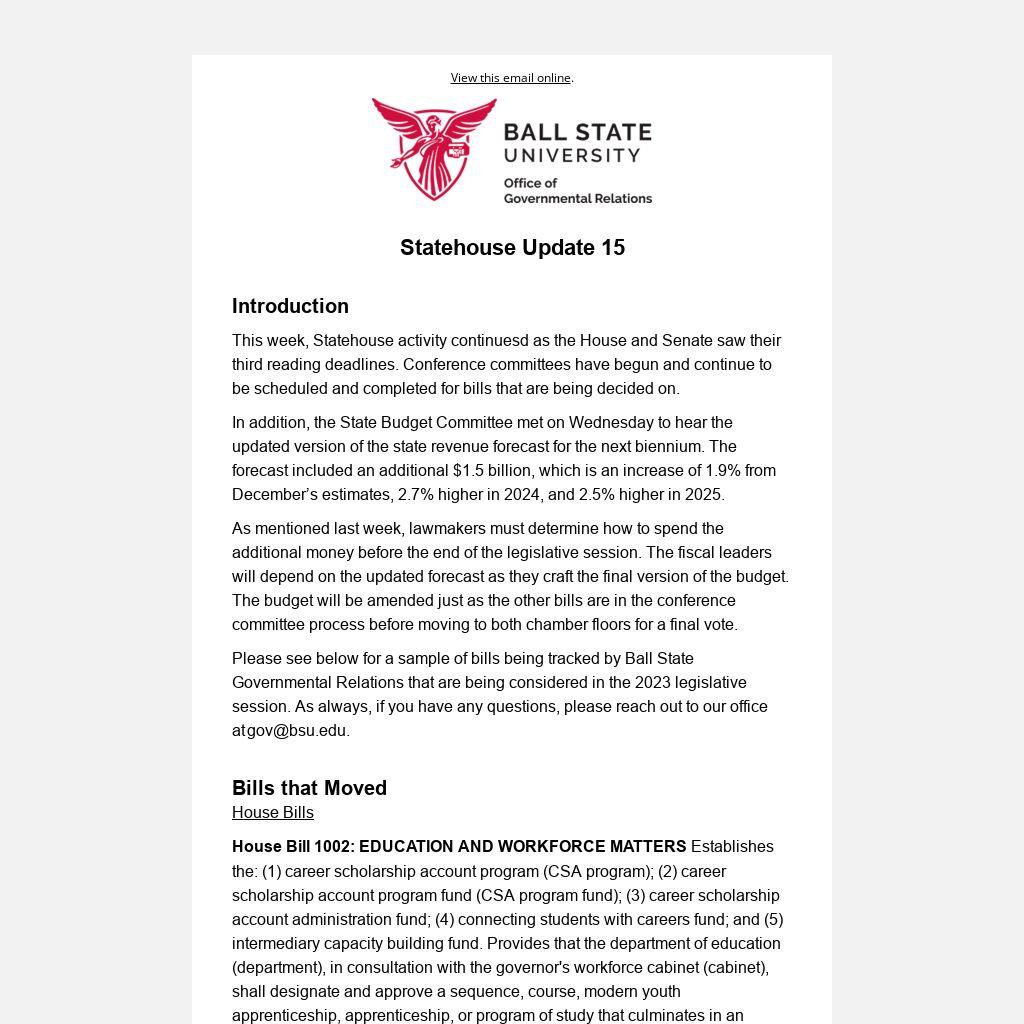 Please see below for a sample of bills being tracked by Ball State Governmental Relations that are being considered in the 2023 legislative session. As always, if you have any questions, please reach out to our office at gov@bsu.edu.