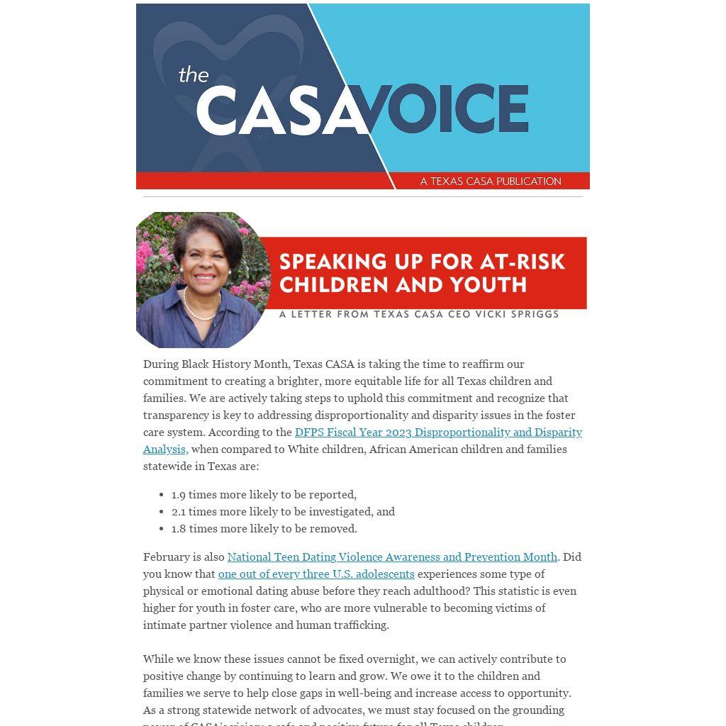 During Black History Month, Texas CASA is taking the time to reaffirm our commitment to creating a brighter, more equitable life for all Texas children and families. We are actively taking steps to uphold this commitment and recognize that transparency is key to addressing disproportionality and disparity issues in the foster care system. According to the DFPS Fiscal Year 2023 Disproportionality and Disparity Analysis, when compared to White children, African American children and families statewide in Texas are: