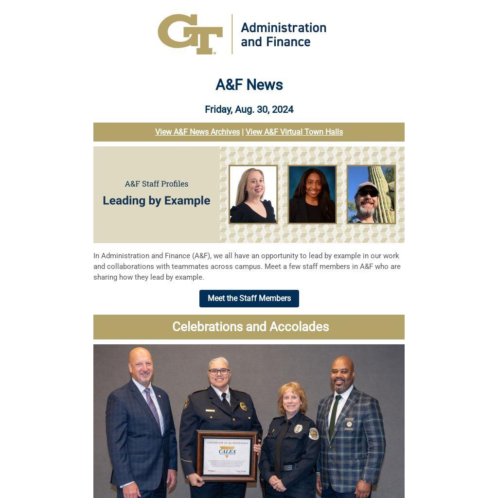 At the August A&F Hybrid Town Hall, Dr. Bolton kicked off the start of 2024-2025 academic year with an update on the Institute Strategic Plan including key areas of focus for A&F. Several A&F leaders shared how their teams are leading by example and cultivating wellbeing. They discussed prioritizing sustainability, preparing for the unified enterprise resource planning system, and demonstrating the Institute’s commitment to fostering a working and learning environment where everyone’s contribution is recognized and valued.