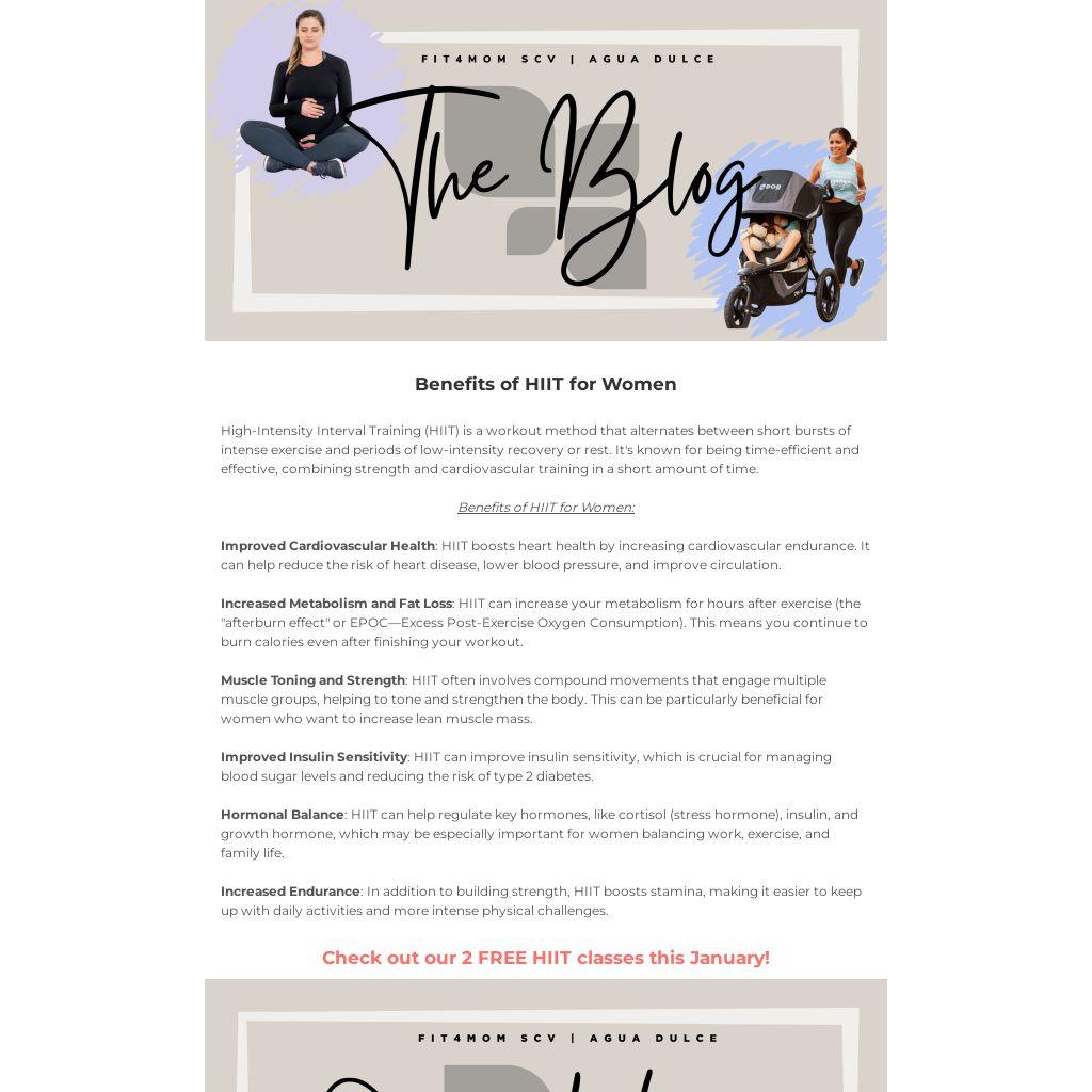 Postpartum recovery varies for each woman, but HIIT can be a useful tool to regain strength and fitness after childbirth, assuming it's safe for the individual (and they’ve received medical clearance). Here are some specific ways HIIT can help: