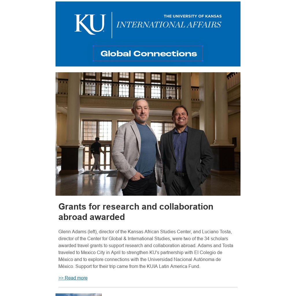 Glenn Adams (left), director of the Kansas African Studies Center, and Luciano Tosta, director of the Center for Global & International Studies, were two of the 34 scholars awarded travel grants to support research and collaboration abroad. Adams and Tosta traveled to Mexico City in April to strengthen KU's partnership with El Colegio de México and to explore connections with the Universidad Nacional Autónoma de México. Support for their trip came from the KUIA Latin America Fund.