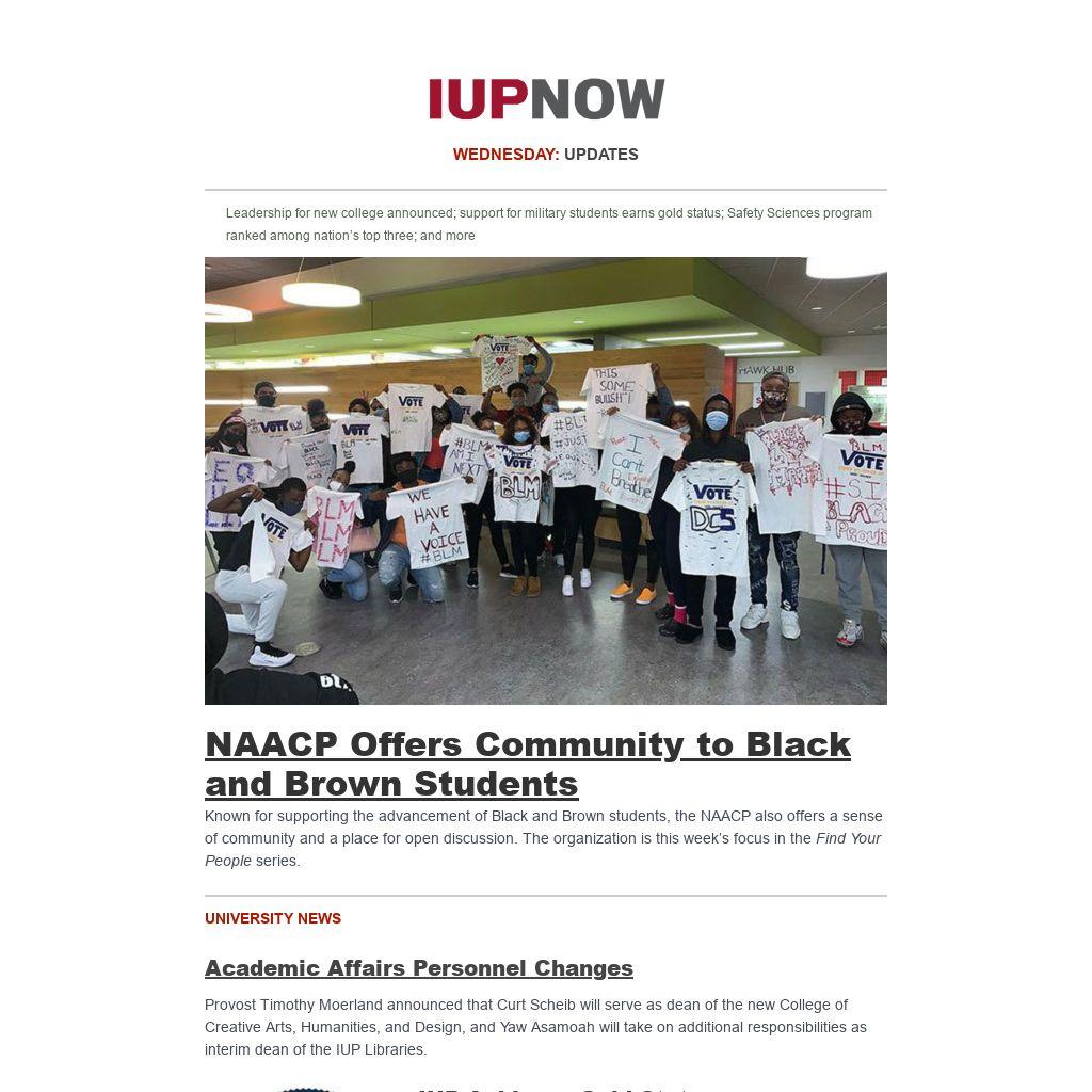 Distributed to IUP employees and students four days a week, IUP Now is the official newsletter of Indiana University of Pennsylvania. It features news from across the IUP website, compiled by the Division of Marketing and Communications. Find out how to get your news and events in IUP Now.