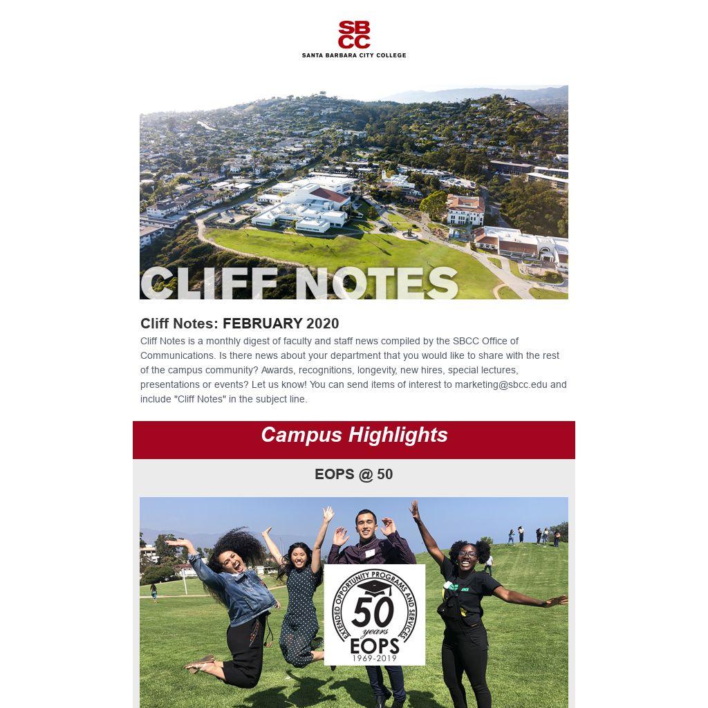 Cliff Notes: FEBRUARY 2020Cliff Notes is a monthly digest of faculty and staff news compiled by the SBCC Office of Communications. Is there news about your department that you would like to share with the rest of the campus community? Awards, recognitions, longevity, new hires, special lectures, presentations or events? Let us know! You can send items of interest to marketing@sbcc.edu and include "Cliff Notes" in the subject line.