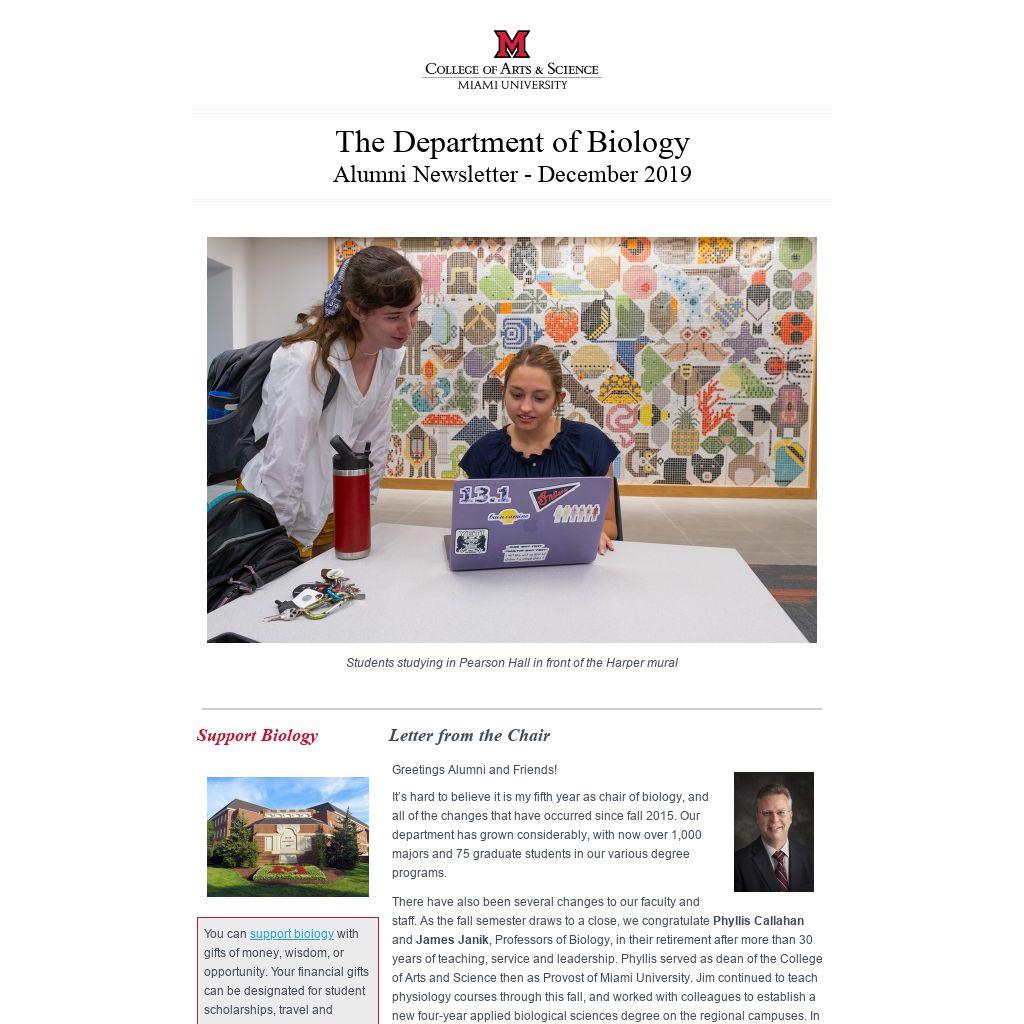 There have also been several changes to our faculty and staff. As the fall semester draws to a close, we congratulate Phyllis Callahan and James Janik, Professors of Biology, in their retirement after more than 30 years of teaching, service and leadership. Phyllis served as dean of the College of Arts and Science then as Provost of Miami University. Jim continued to teach physiology courses through this fall, and worked with colleagues to establish a new four-year applied biological sciences degree on the regional campuses. In summer, Jack Keegan also retired after more than 40 years as the greenhouse manger and horticulture instructor – read more about his contributions in the article below.