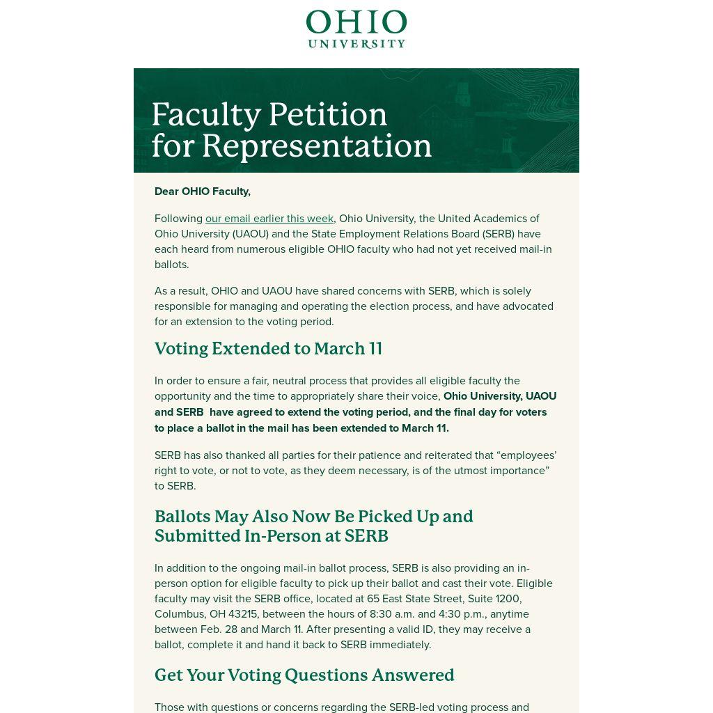 In order to ensure a fair, neutral process that provides all eligible faculty the opportunity and the time to appropriately share their voice, Ohio University, UAOU and SERB have agreed to extend the voting period, and the final day for voters to place a ballot in the mail has been extended to March 11.