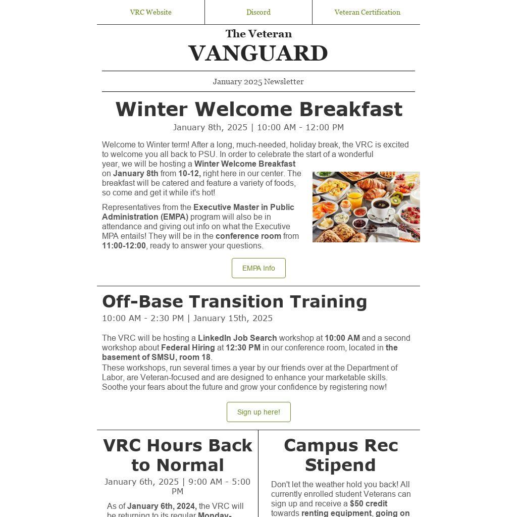 As of January 6th, 2024, the VRC will be returning to its regular Monday-Friday, 9-5 schedule. Our doors will be open bright and early Monday morning with hot coffee to start your term off right, so make sure to stop by and say hello!