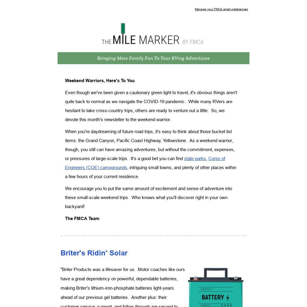 Even though we've been given a cautionary green light to travel, it's obvious things aren't quite back to normal as we navigate the COVID-19 pandemic. While many RVers are hesitant to take cross-country trips, others are ready to venture out a little. So, we devote this month's newsletter to the weekend warrior.