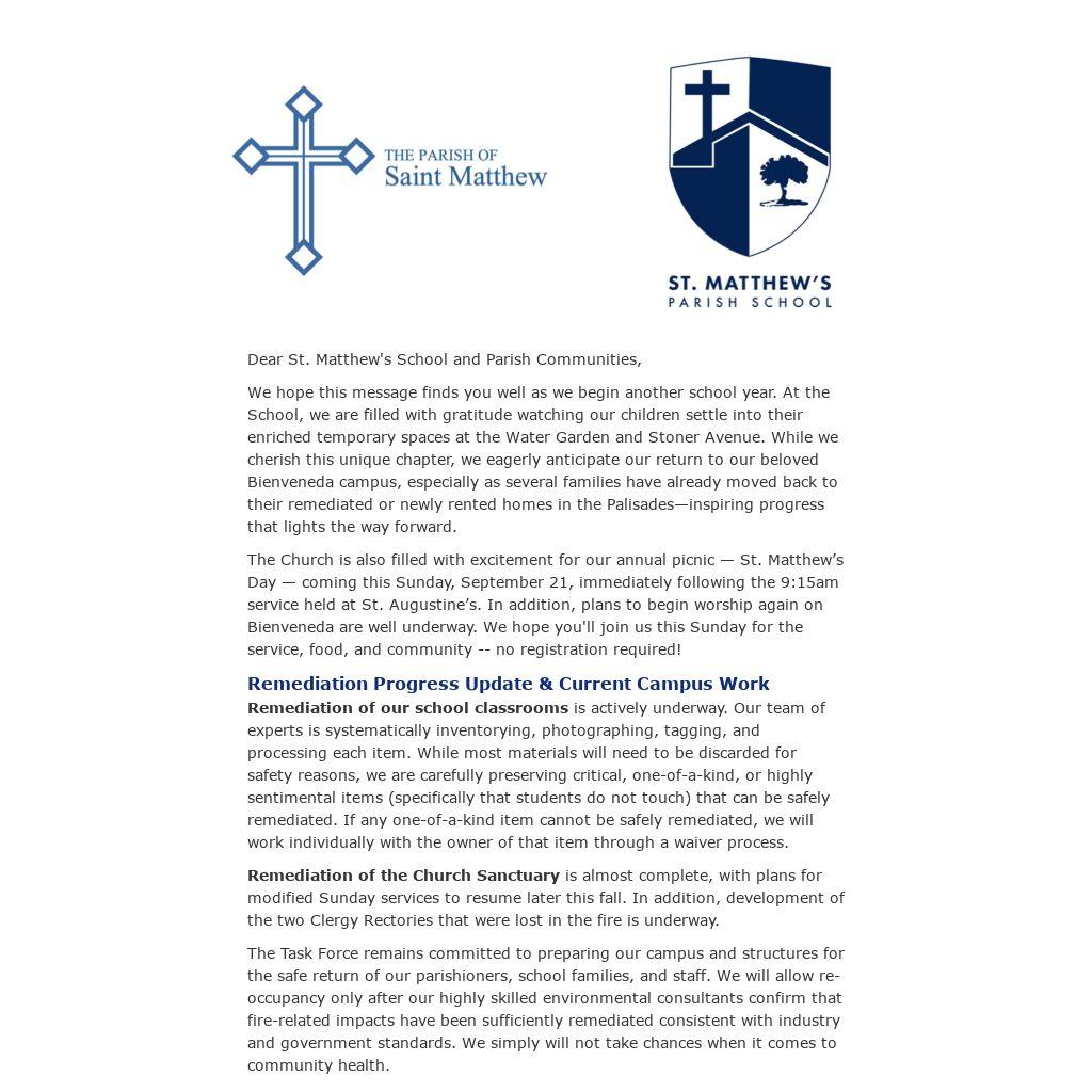 Dear St. Matthew's School and Parish Communities,