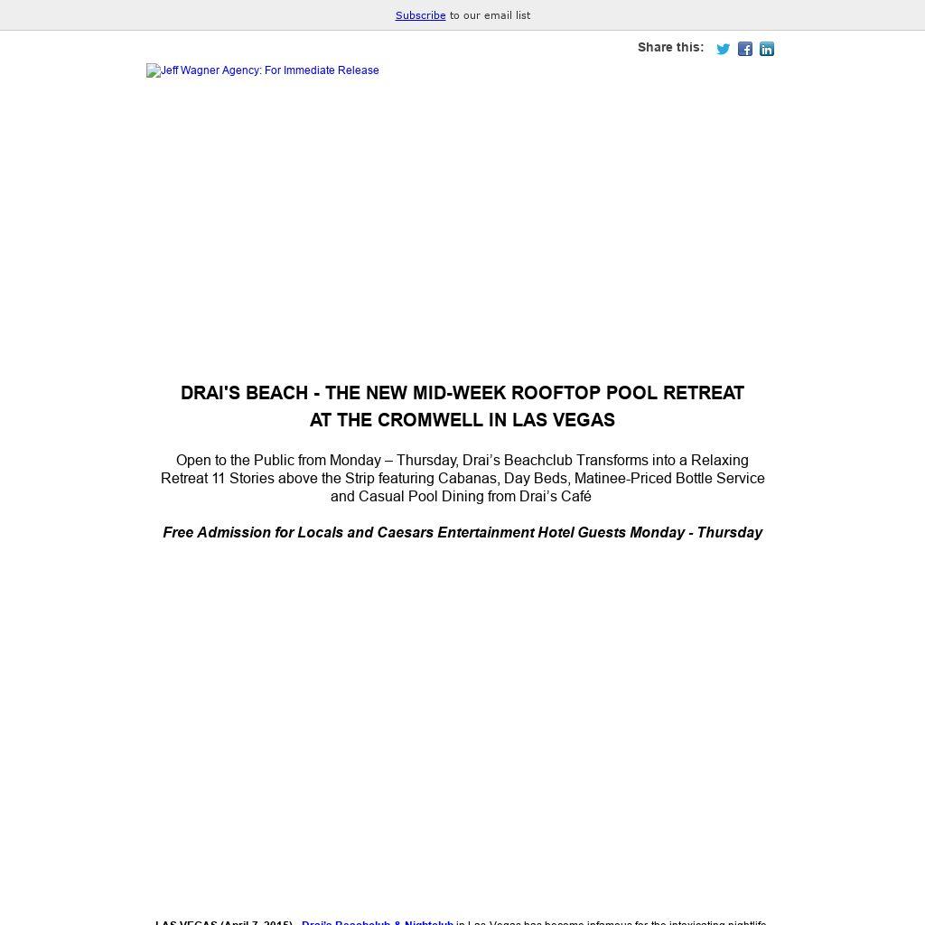 LAS VEGAS (April 7, 2015) - Drai’s Beachclub & Nightclub in Las Vegas has become infamous for the intoxicating nightlife, DJ’s and all-night parties, and now Drai’s has created a new daytime yin to the night’s usual yang – it’s called Drai’s Beach; a high-altitude midweek refresher for those 21 and over featuring Drai’s signature pools, rooftop palm trees and now, new day-long best-value bottle service every Monday-Thursday from 11:00 a.m. – 6:00 p.m.