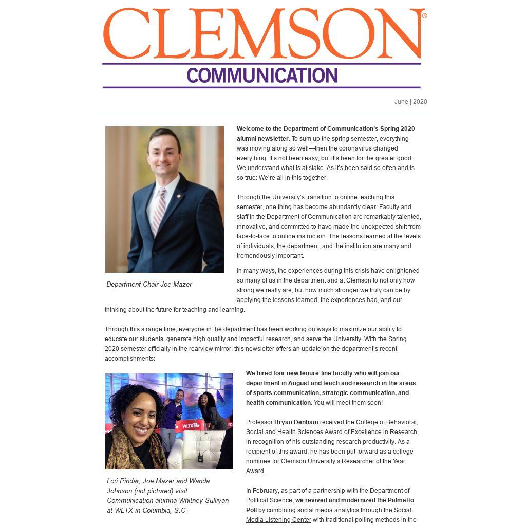 During this time of uncertainty and ever-changing circumstances, please know that your Clemson Communication Department family is thinking of you. We’ve watched how Tigers across the country have shown love, compassion, and kindness to neighbors, family, and those in need.