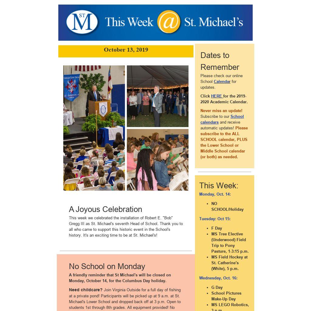 A friendly reminder that St Michael's will be closed on Monday, October 14, for the Columbus Day holiday.