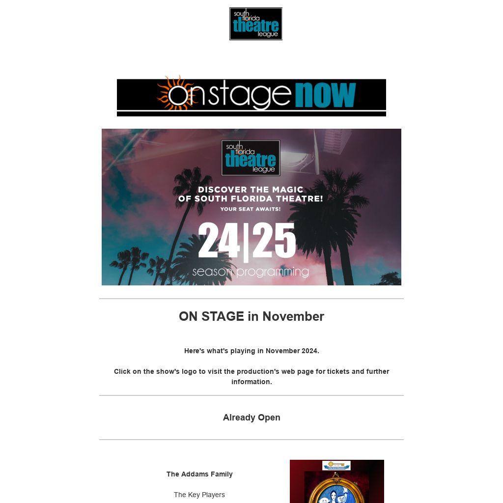 Here's what's playing in November 2024. Click on the show's logo to visit the production's web page for tickets and further information.