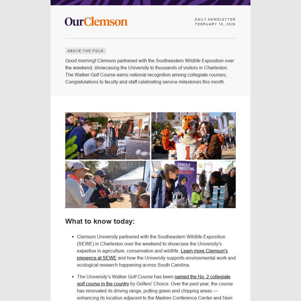 Good morning! Clemson partnered with the Southeastern Wildlife Exposition over the weekend, showcasing the University to thousands of visitors in Charleston. The Walker Golf Course earns national recognition among collegiate courses; Congratulations to faculty and staff celebrating service milestones this month.
