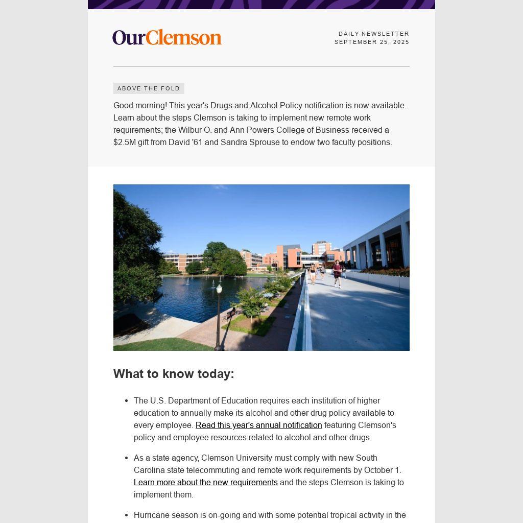 Learn about the steps Clemson is taking to implement new remote work requirements; the Wilbur O. and Ann Powers College of Business received a $2.5M gift from David '61 and Sandra Sprouse to endow two faculty positions.