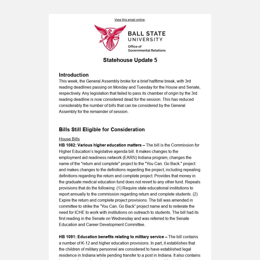 HB 1082: Various higher education matters – The bill is the Commission for Higher Education’s legislative agenda bill. It makes changes to the employment aid readiness network (EARN) Indiana program, changes the name of the "return and complete" project to the "You Can. Go Back." project and makes changes to the definitions regarding the project, including repealing definitions regarding the return and complete project. Provides that money in the graduate medical education fund does not revert to any other fund. Repeals provisions that do the following: (1) Require state educational institutions to report annually to the commission regarding return and complete students. (2) Expire the return and complete project provisions. The bill was amended in committee to strike the “You Can. Go Back” project name and to reiterate the need for ICHE to work with institutions on outreach to students. The bill had its first reading in the Senate on Wednesday and was referred to the Senate Education and Career Development Committee.