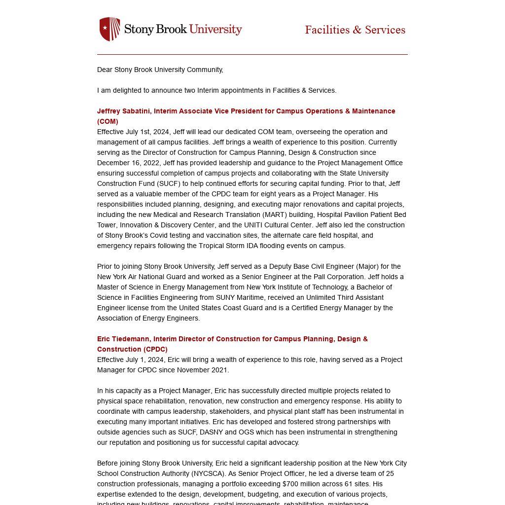 Effective July 1st, 2024, Jeff will lead our dedicated COM team, overseeing the operation and management of all campus facilities. Jeff brings a wealth of experience to this position. Currently serving as the Director of Construction for Campus Planning, Design & Construction since December 16, 2022, Jeff has provided leadership and guidance to the Project Management Office ensuring successful completion of campus projects and collaborating with the State University Construction Fund (SUCF) to help continued efforts for securing capital funding. Prior to that, Jeff served as a valuable member of the CPDC team for eight years as a Project Manager. His responsibilities included planning, designing, and executing major renovations and capital projects, including the new Medical and Research Translation (MART) building, Hospital Pavilion Patient Bed Tower, Innovation & Discovery Center, and the UNITI Cultural Center. Jeff also led the construction of Stony Brook’s Covid testing and vaccination sites, the alternate care field hospital, and emergency repairs following the Tropical Storm IDA flooding events on campus.