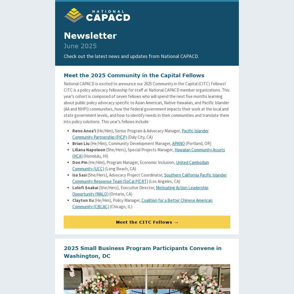 National CAPACD is excited to announce our 2025 Community in the Capital (CITC) Fellows! CITC is a policy advocacy fellowship for staff at National CAPACD member organizations. This year’s cohort is composed of seven fellows who will spend the next five months learning about public policy advocacy specific to Asian American, Native Hawaiian, and Pacific Islander (AA and NHPI) communities, how the federal government impacts their work at the local and state government levels, and how to identify needs in their communities and translate them into policy solutions. This year’s fellows include: