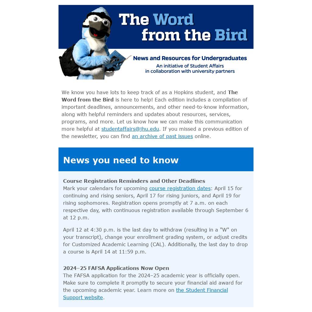 We know you have lots to keep track of as a Hopkins student, and The Word from the Bird is here to help! Each edition includes a compilation of important deadlines, announcements, and other need-to-know information, along with helpful reminders and updates about resources, services, programs, and more. Let us know how we can make this communication more helpful at studentaffairs@jhu.edu. If you missed a previous edition of the newsletter, you can find an archive of past issues online.