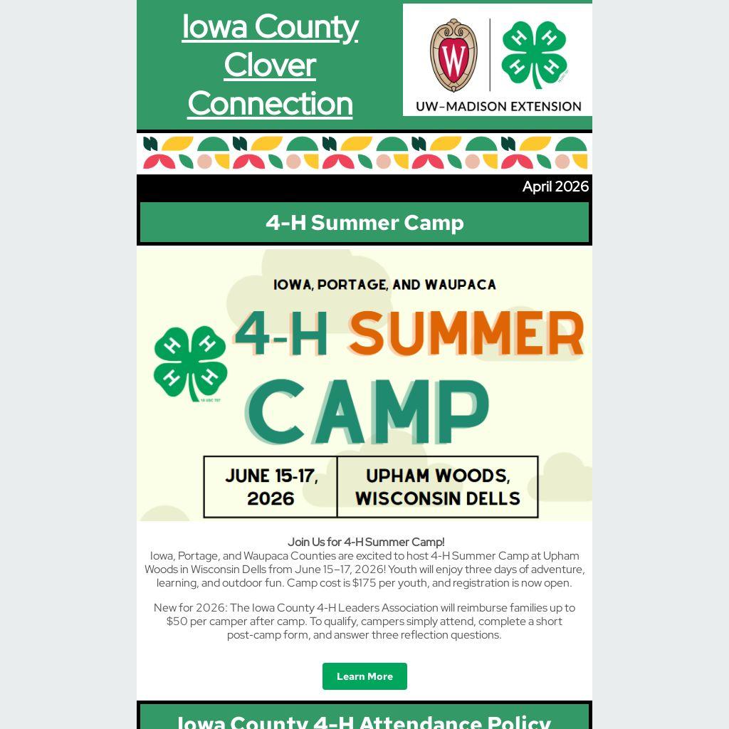 New for 2026: The Iowa County 4‑H Leaders Association will reimburse families up to $50 per camper after camp. To qualify, campers simply attend, complete a short post‑camp form, and answer three reflection questions.