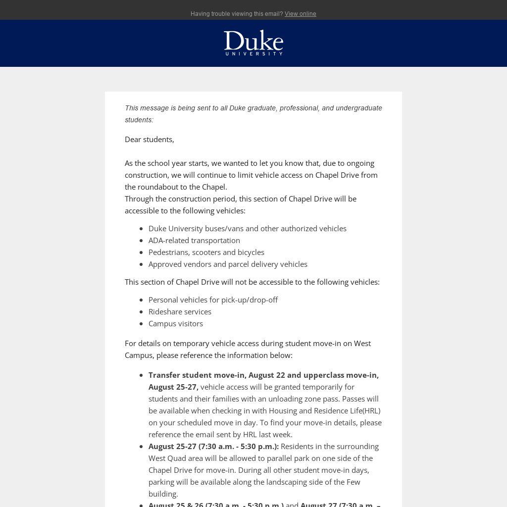 This message is being sent to all Duke graduate, professional, and undergraduate students: