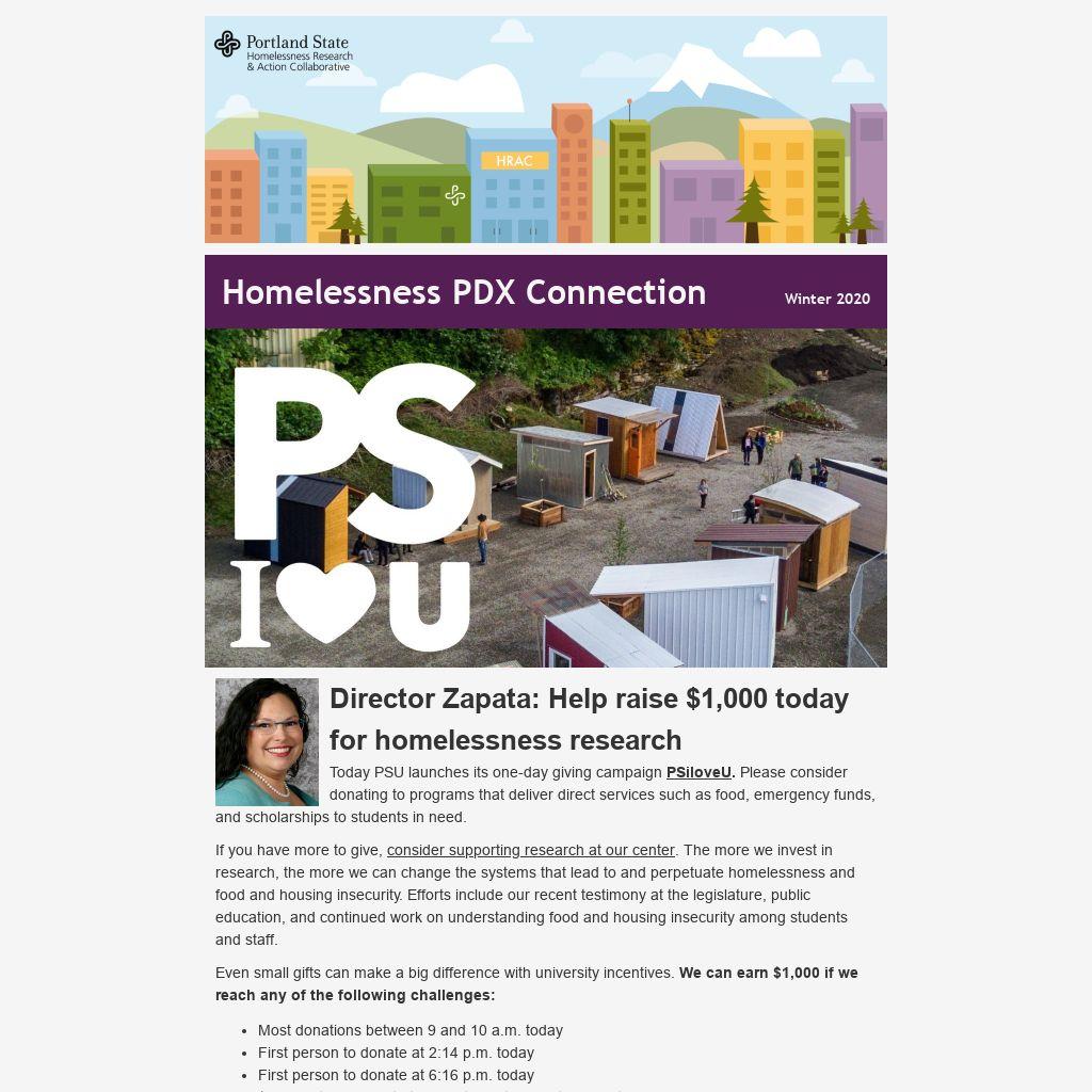 Director Zapata: Help raise $1,000 today for homelessness research Today PSU launches its one-day giving campaign PSiloveU. Please consider donating to programs that deliver direct services such as food, emergency funds, and scholarships to students in need.