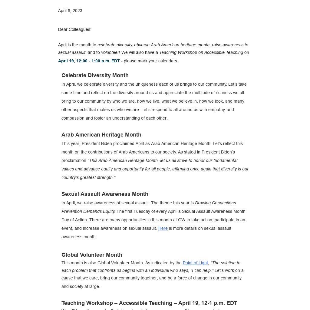April is the month to celebrate diversity, observe Arab American heritage month, raise awareness to sexual assault, and to volunteer! We will also have a Teaching Workshop on Accessible Teaching on April 19, 12:00 - 1:00 p.m. EDT - please mark your calendars.
