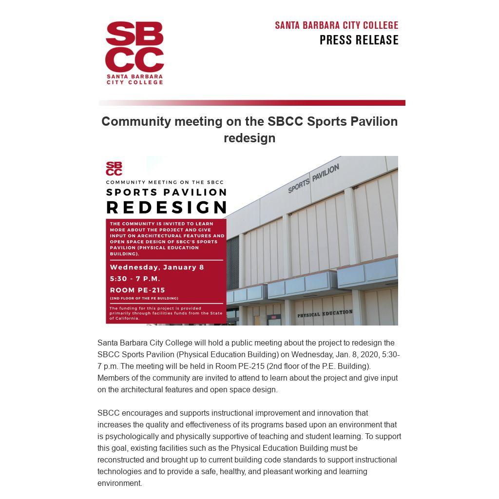 Santa Barbara City College will hold a public meeting about the project to redesign the SBCC Sports Pavilion (Physical Education Building) on Wednesday, Jan. 8, 2020, 5:30-7 p.m. The meeting will be held in Room PE-215 (2nd floor of the P.E. Building). Members of the community are invited to attend to learn about the project and give input on the architectural features and open space design.