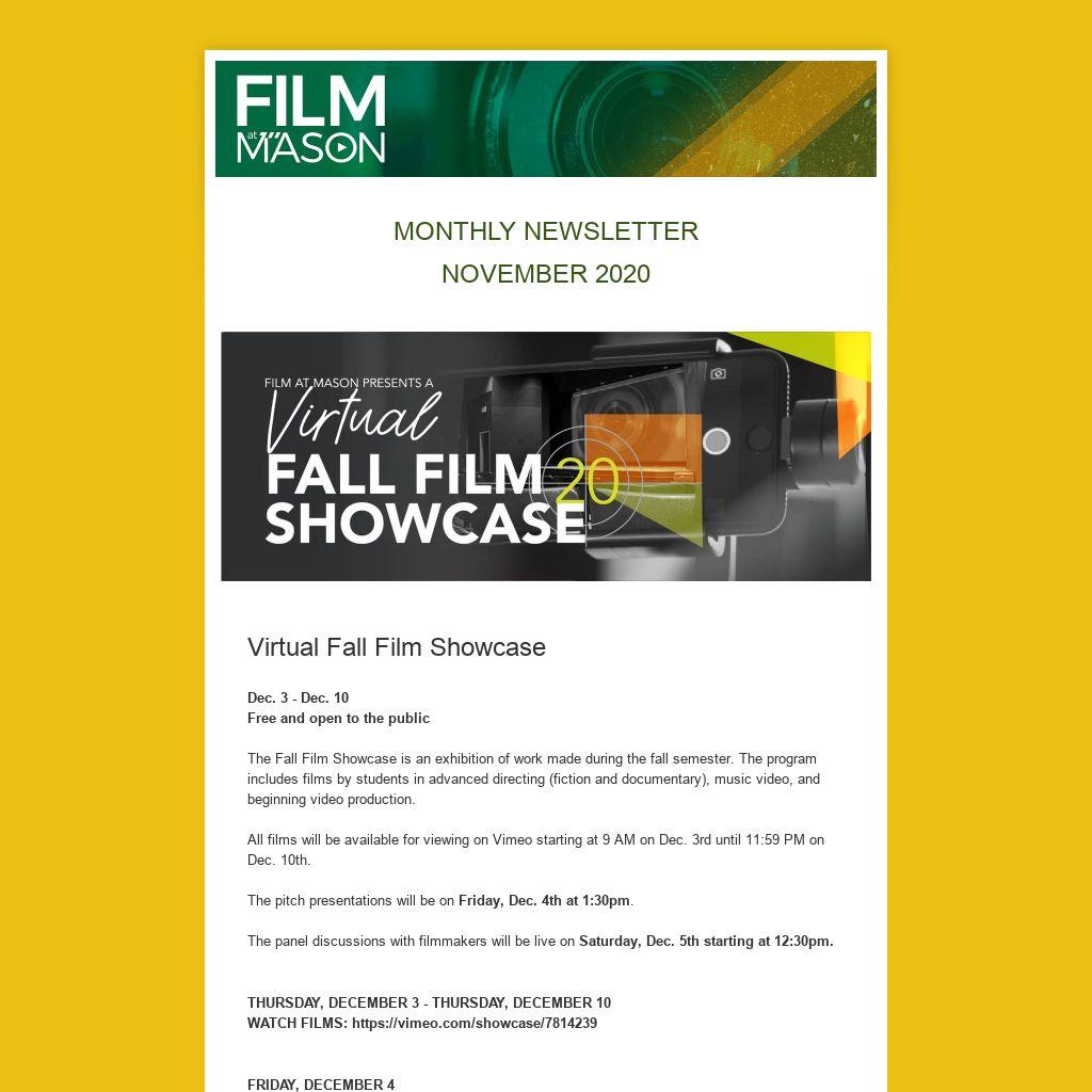 We want to hear from you! If you have news you would like to contribute, please send it to film@gmu.edu. We are looking for regional film events and updates from Film at Mason alumni. Keep up-to-date on all the current Film at Mason news at film.gmu.edu.