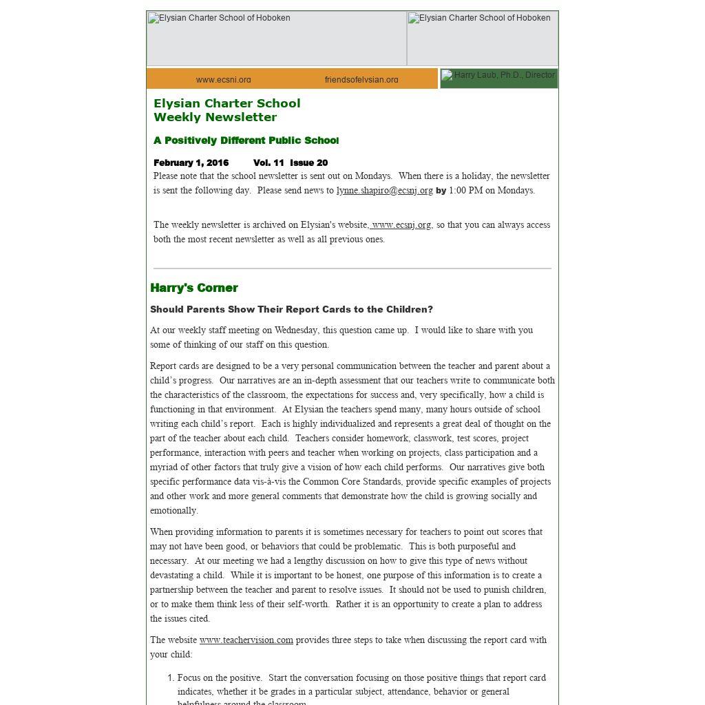 The weekly newsletter is archived on Elysian's website, www.ecsnj.org, so that you can always access both the most recent newsletter as well as all previous ones.
