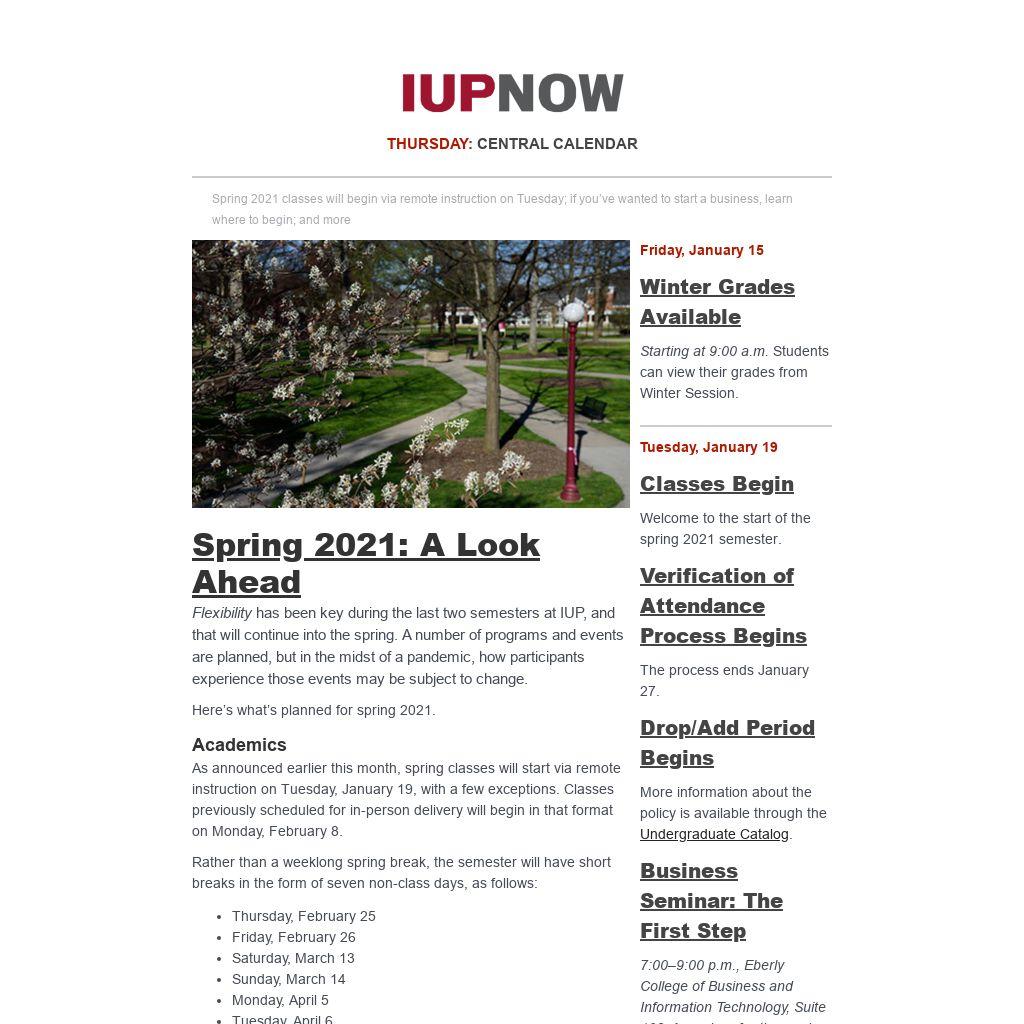 Distributed to IUP employees and students four days a week, IUP Now is the official newsletter of Indiana University of Pennsylvania. It features news from across the IUP website, compiled by the Division of Marketing and Communications. Find out how to get your news and events in IUP Now.