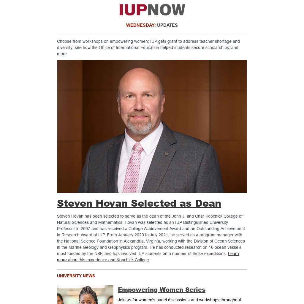 Distributed to IUP employees and students twice a week, IUP Now is the official newsletter of Indiana University of Pennsylvania. It features news from across the IUP website, compiled by the Division of Marketing and Communications. Find out how to get your news and events in IUP Now.