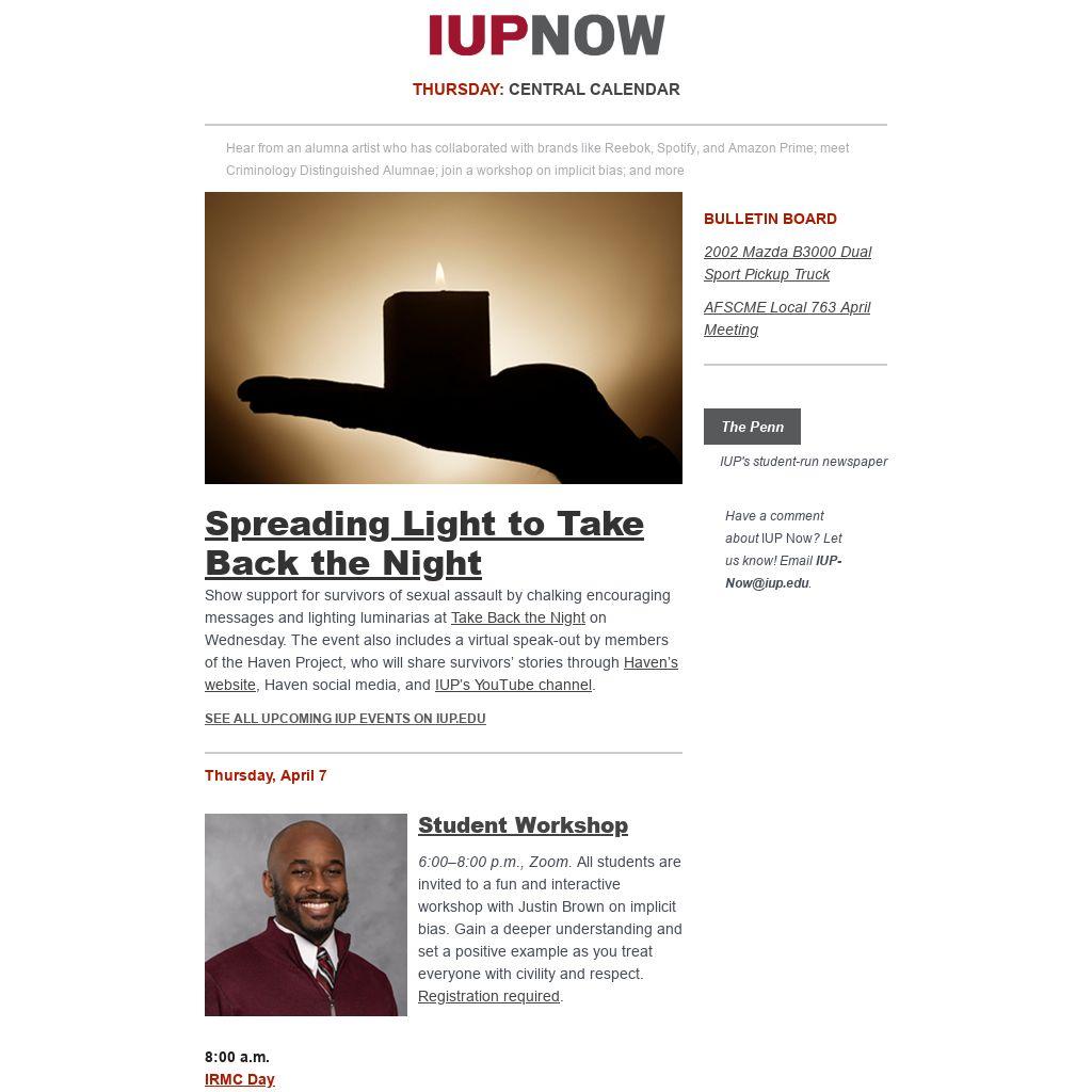 Distributed to IUP employees and students three days a week, IUP Now is the official newsletter of Indiana University of Pennsylvania. It features news from across the IUP website, compiled by the Division of Marketing and Communications. Find out how to get your news and events in IUP Now.