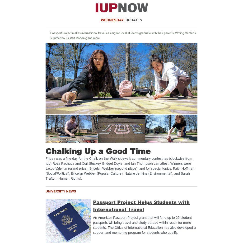 Friday was a fine day for the Chalk-on-the-Walk sidewalk commentary contest, as (clockwise from top) Rosa Pachuca and Cori Stuckey, Bridget Doyle, and Ian Thompson can attest. Winners were Jacob Valentin (grand prize), Bricelyn Webber (second place), and for special topics, Faith Hoffman (Social/Political), Bricelyn Webber (Popular Culture), Natalie Jenkins (Environmental), and Sarah Trafton (Human Rights).