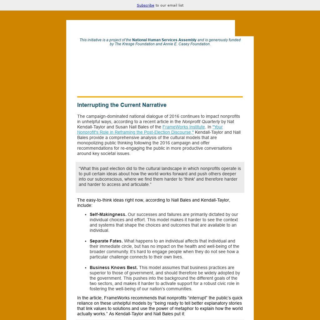 In the article, FrameWorks recommends that nonprofits “interrupt” the public’s quick reliance on these unhelpful models by “being ready to tell better explanatory stories that link values to solutions and use the power of metaphor to explain how the world actually works.” As Kendall-Taylor and Nall Bales put it: