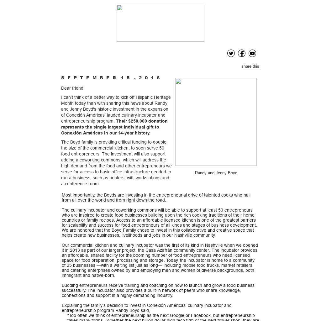 “Too often we think of entrepreneurship as the next Google or Facebook, but entrepreneurship takes many forms. Whether the next billion dollar high tech firm or the next flower shop, they are all very important. One area that is underserved but has tremendous potential is food entrepreneurs. Whether starting a catering service, a restaurant or a new consumer product, opportunities abound. And the cost to start is small. All one needs is access to a licensed commercial kitchen. Conexión Américas culinary incubator is providing that opportunity. Jenny and I are happy to be able to support their expansion and to provide an opportunity for more culinary entrepreneurs. Who knows? One may become the next Tennessee Bun Company, Mars, or Bush's.”
