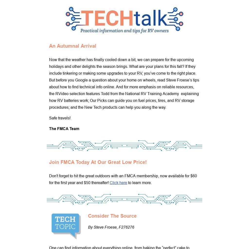 Now that the weather has finally cooled down a bit, we can prepare for the upcoming holidays and other delights the season brings. What are your plans for this fall? If they include tinkering or making some upgrades to your RV, you’ve come to the right place. But before you Google a question about your home on wheels, read Steve Froese’s tips about how to find technical info online. And for more emphasis on reliable resources, the RVideo selection features Todd from the National RV Training Academy explaining how RV batteries work; Our Picks can guide you on fuel prices, tires, and RV storage procedures; and the New Tech products can help you along the way.