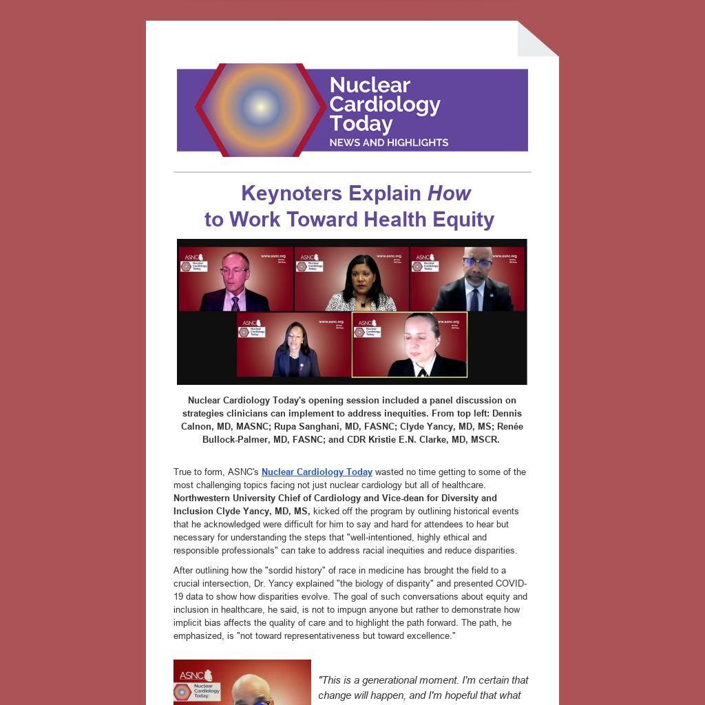| True to form, ASNC's Nuclear Cardiology Today wasted no time getting to some of the most challenging topics facing not just nuclear cardiology but all of healthcare. Northwestern University Chief of Cardiology and Vice-dean for Diversity and Inclusion Clyde Yancy, MD, MS, kicked off the program by outlining historical events that he acknowledged were difficult for him to say and hard for attendees to hear but necessary for understanding the steps that "well-intentioned, highly ethical and responsible professionals" can take to address racial inequities and reduce disparities.
