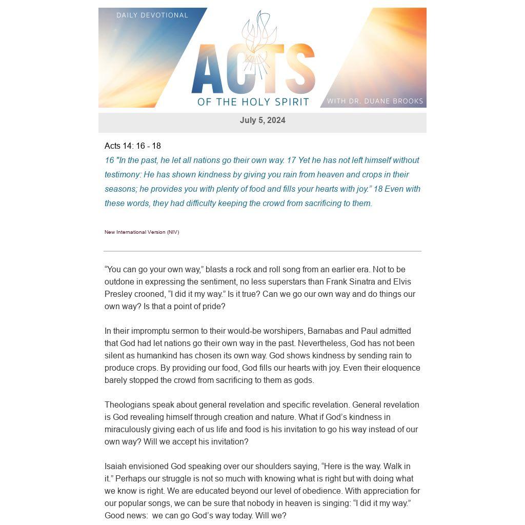 Theologians speak about general revelation and specific revelation. General revelation is God revealing himself through creation and nature. What if God’s kindness in miraculously giving each of us life and food is his invitation to go his way instead of our own way? Will we accept his invitation?