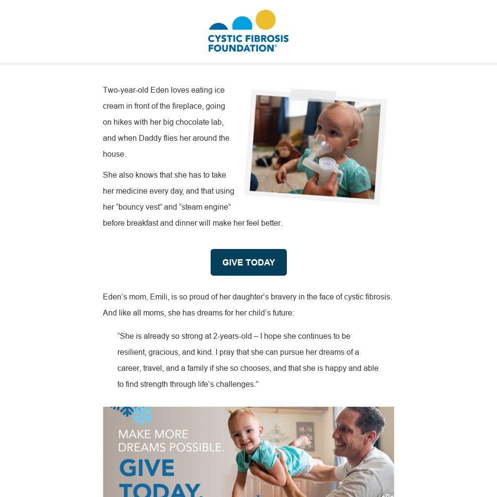Two-year-old Eden loves eating ice cream in front of the fireplace, going on hikes with her big chocolate lab, and when Daddy flies her around the house.