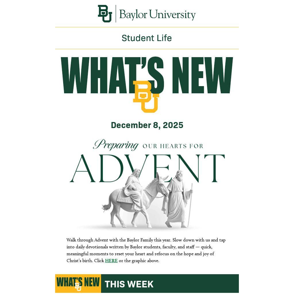 Walk through Advent with the Baylor Family this year. Slow down with us and tap into daily devotionals written by Baylor students, faculty, and staff — quick, meaningful moments to reset your heart and refocus on the hope and joy of Christ’s birth. Click HERE or the graphic above.