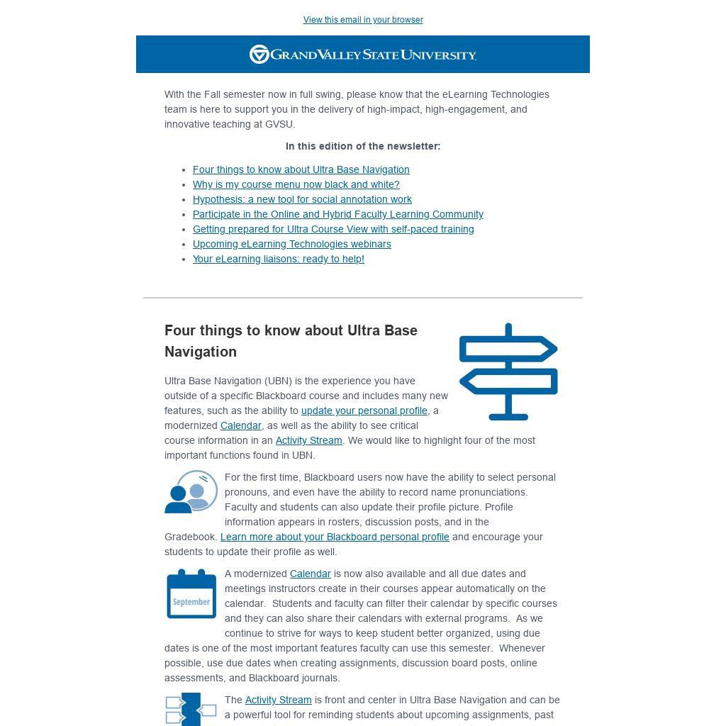 With the Fall semester now in full swing, please know that the eLearning Technologies team is here to support you in the delivery of high-impact, high-engagement, and innovative teaching at GVSU.