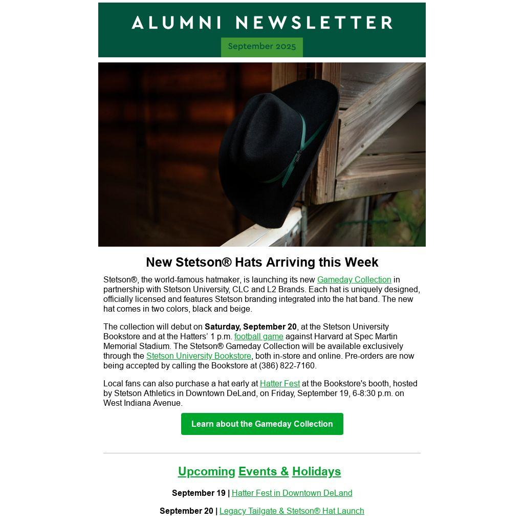 Don't forget to check out Hatter Fest happening this Friday, September 19 from 6-8:30 p.m. in Downtown DeLand! Visit with sports teams from Hatter Athletics as well as John B, and hear from the Stetson Pep Band. A limited amount of the new Stetson® hats will also available for purchase at the Stetson Bookstore's Booth as part of a special pre-sale before the hats officially launch on September 20.