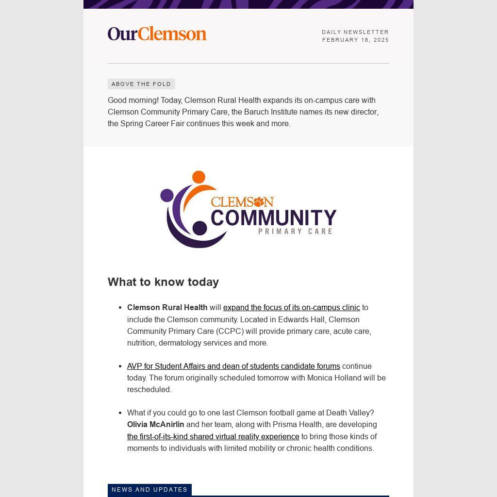 Good morning! Today, Clemson Rural Health expands its on-campus care with Clemson Community Primary Care, the Baruch Institute names its new director, the Spring Career Fair continues this week and more.