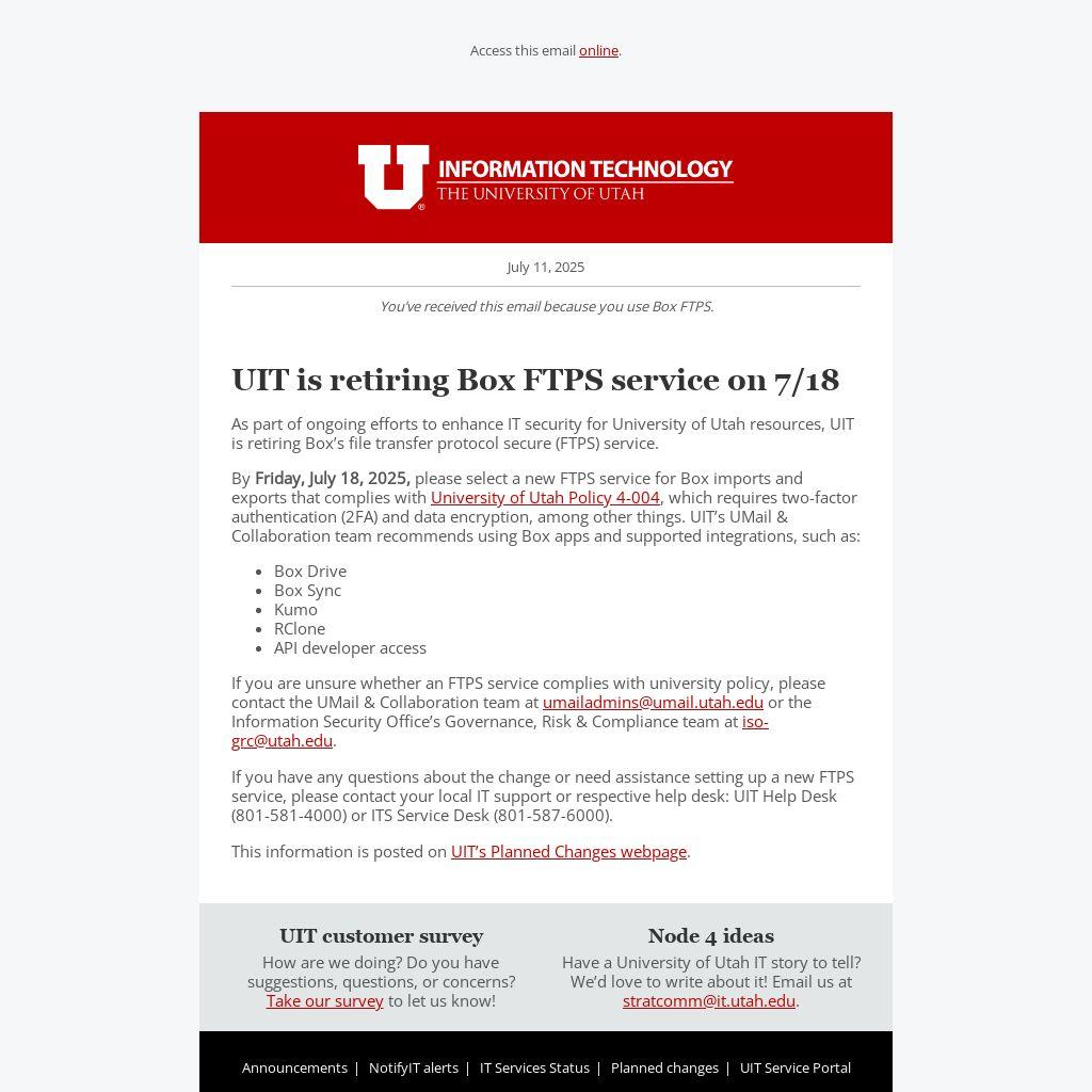 By Friday, July 18, 2025, please select a new FTPS service for Box imports and exports that complies with University of Utah Policy 4-004, which requires two-factor authentication (2FA) and data encryption, among other things. UIT’s UMail & Collaboration team recommends using Box apps and supported integrations, such as: