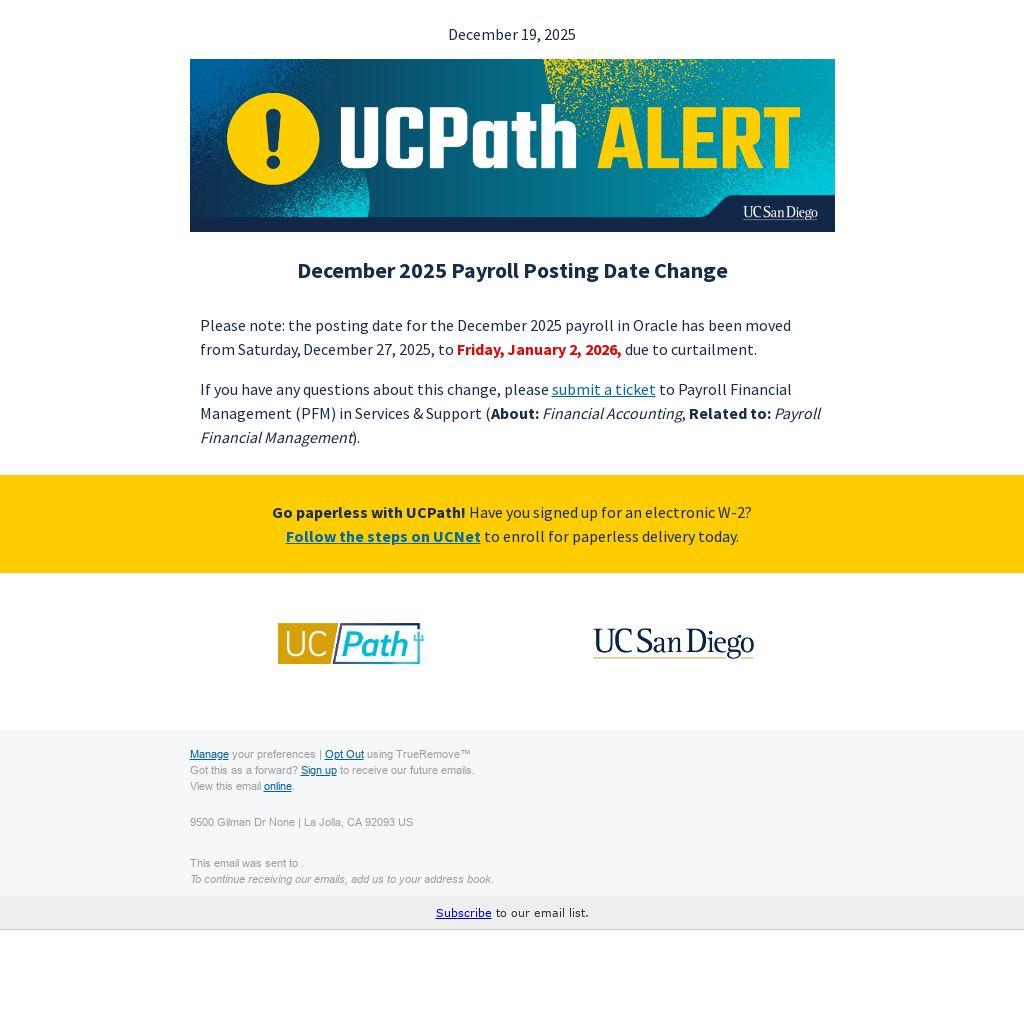 Please note: the posting date for the December 2025 payroll in Oracle has been moved from Saturday, December 27, 2025, to Friday, January 2, 2026, due to curtailment.