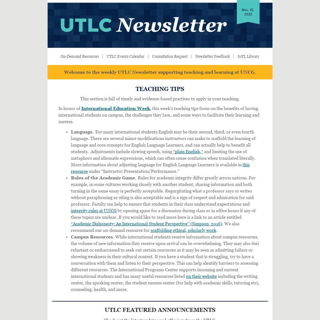 Welcome to the weekly UTLC Newsletter supporting teaching and learning at UNCG.