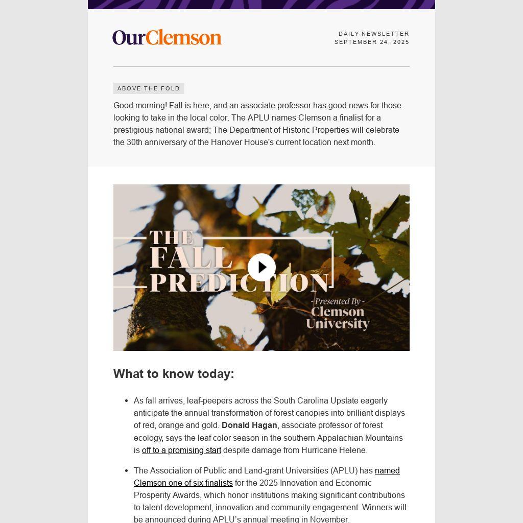 Good morning! Fall is here, and an associate professor has good news for those looking to take in the local color. The APLU names Clemson a finalist for a prestigious national award; The Department of Historic Properties will celebrate the 30th anniversary of the Hanover House's current location next month.