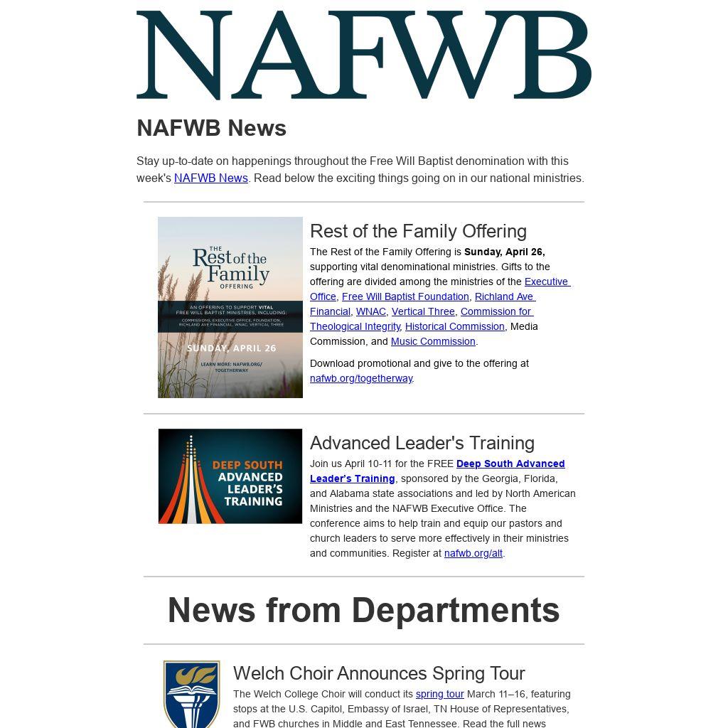 The Rest of the Family Offering is Sunday, April 26, supporting vital denominational ministries. Gifts to the offering are divided among the ministries of the Executive Office, Free Will Baptist Foundation, Richland Ave Financial, WNAC, Vertical Three, Commission for Theological Integrity, Historical Commission, Media Commission, and Music Commission.