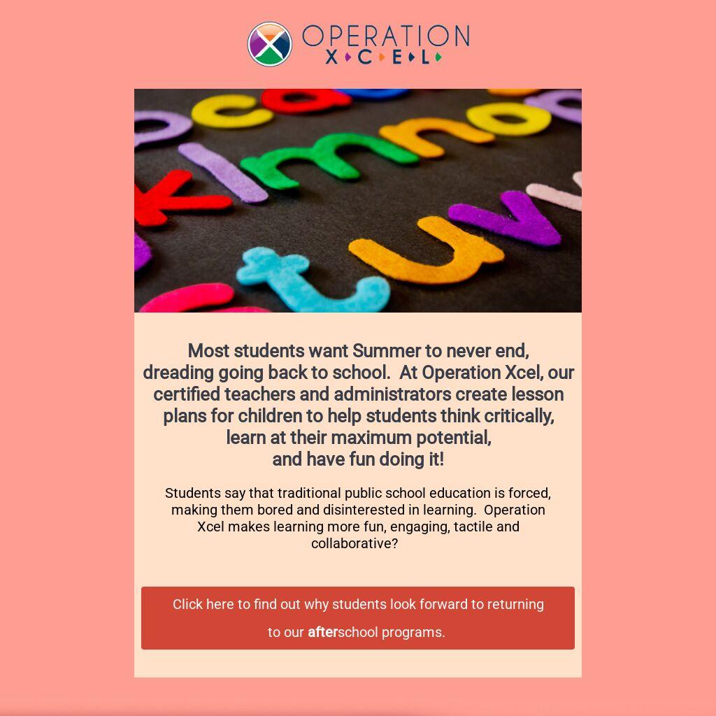 dreading going back to school. At Operation Xcel, our certified teachers and administrators create lesson plans for children to help students think critically, learn at their maximum potential,